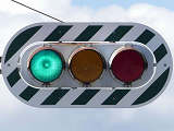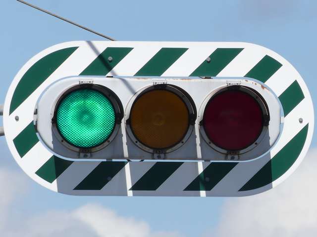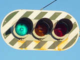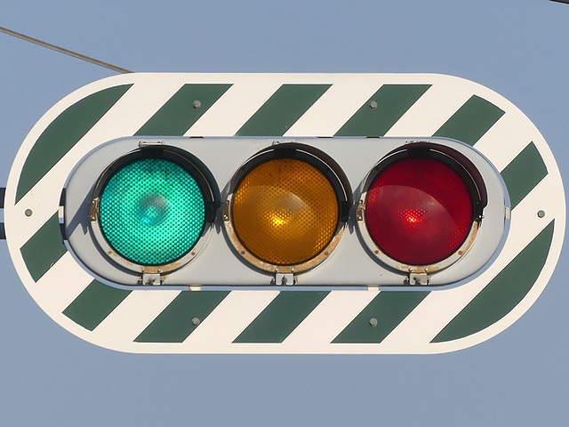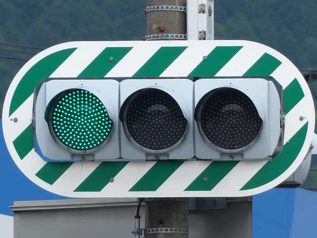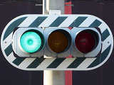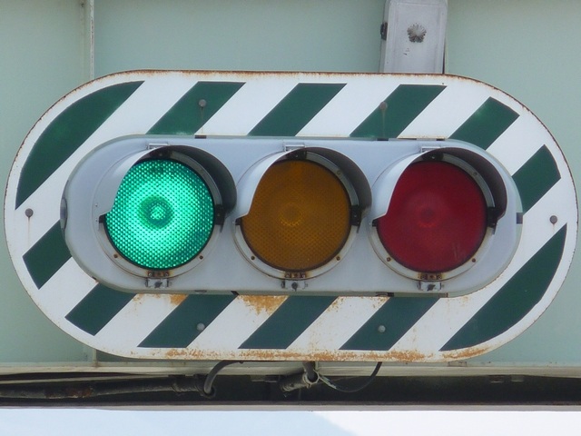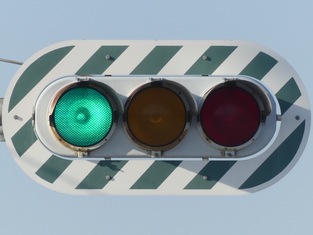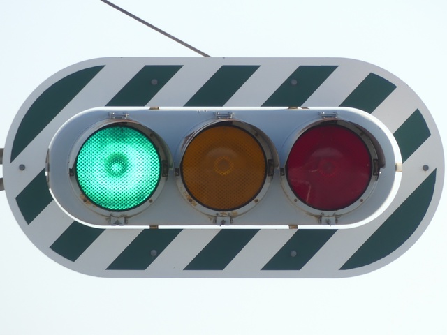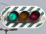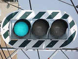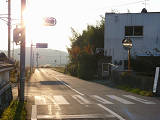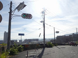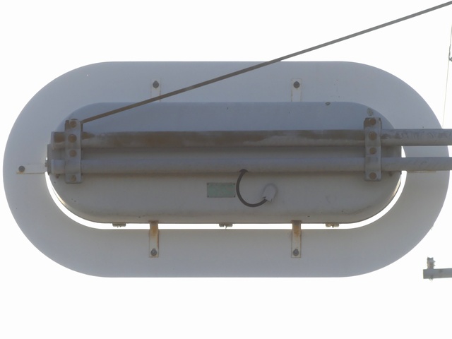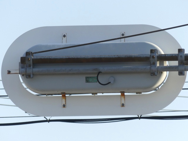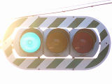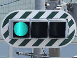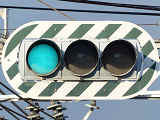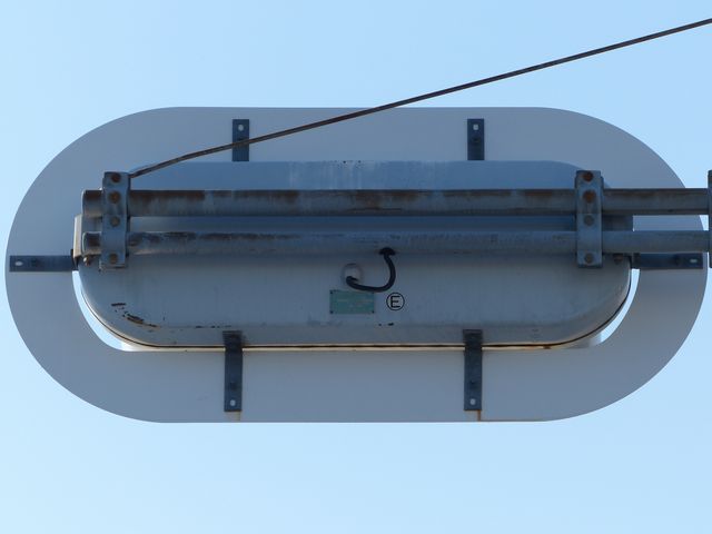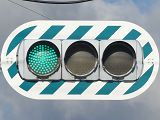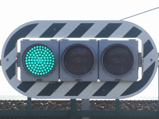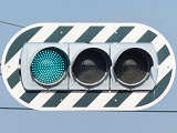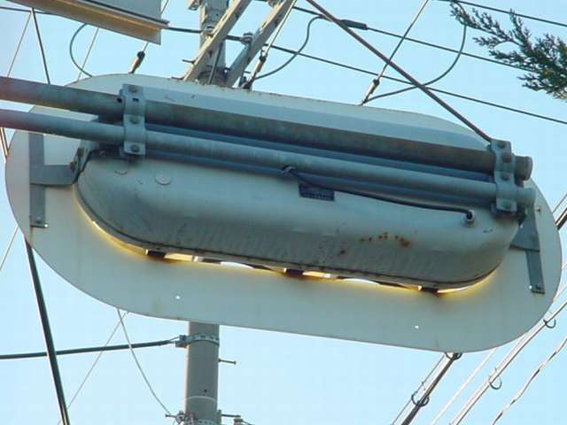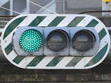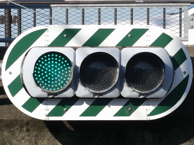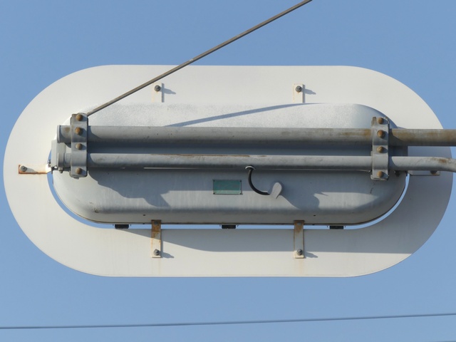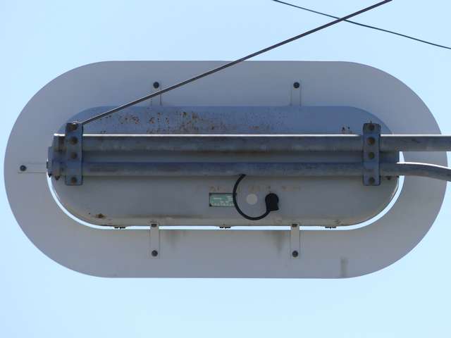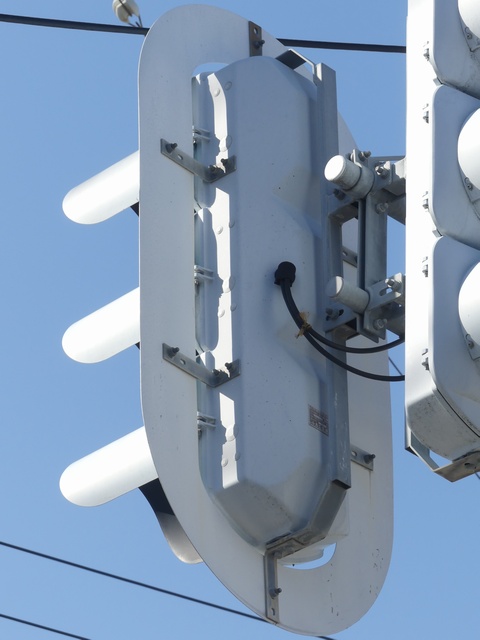 西進用灯器で、バックが琵琶湖のため、朝日の逆光の影響を受けやすいため、信号を見落とさないように灯器に背面板を併設しています。