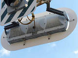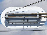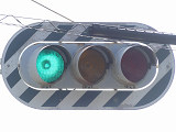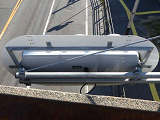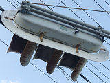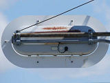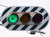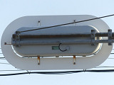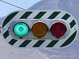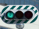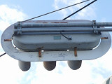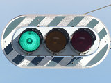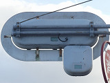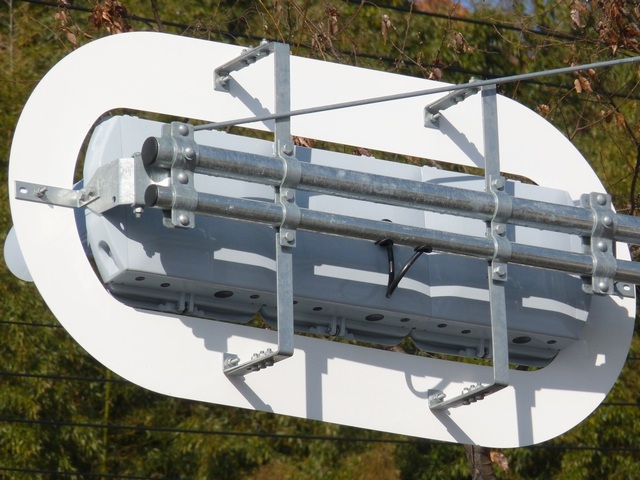 東進用灯器で、バックが琵琶湖のため、朝日の逆光の影響を受けやすいため、信号を見落とさないように灯器に背面板を併設しています。