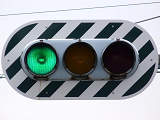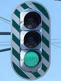 路面電車の往来があり、信号を見落とすと危険なため、灯器に背面板が併設されています。