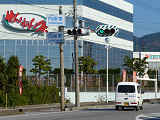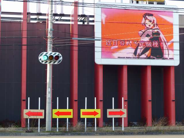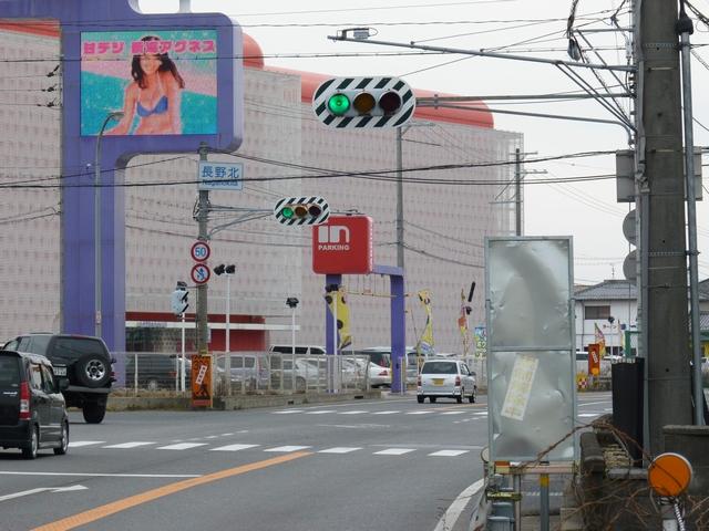 背景にパチンコ店があるため、店舗の明かりで信号を見落とさないよう、灯器に背面板が併設されています。