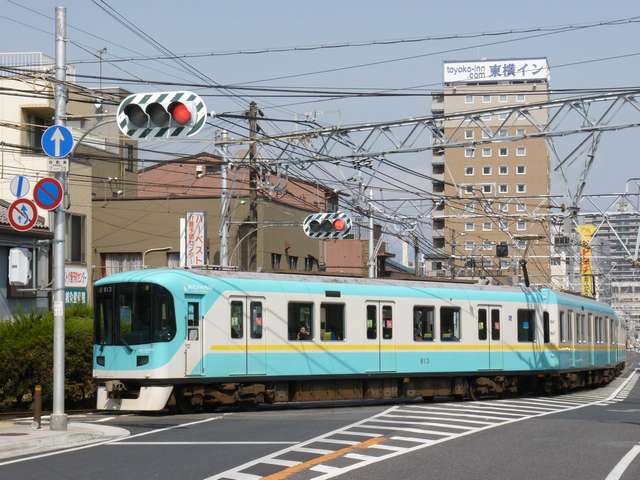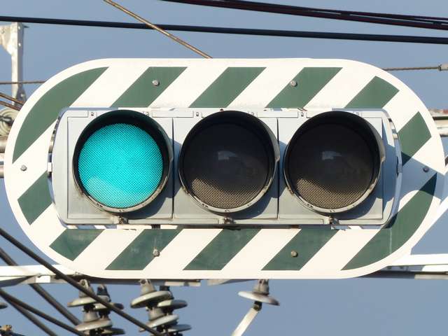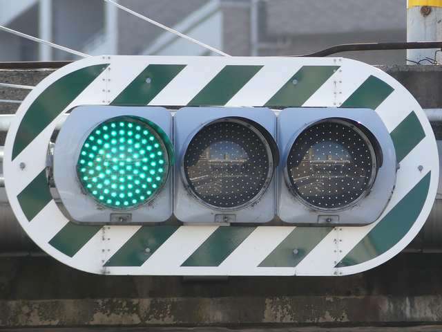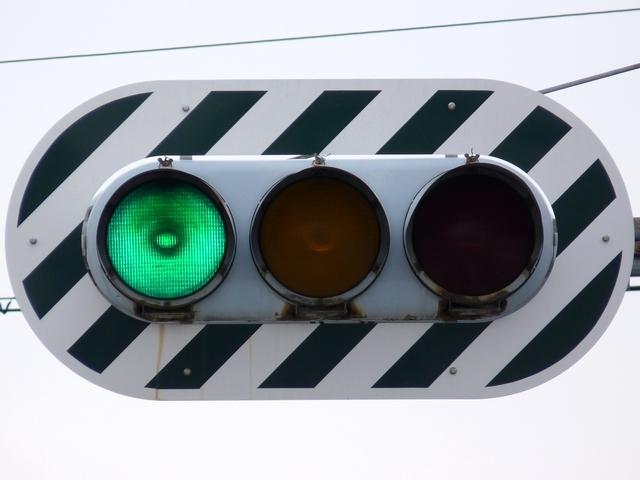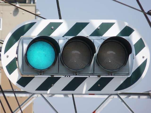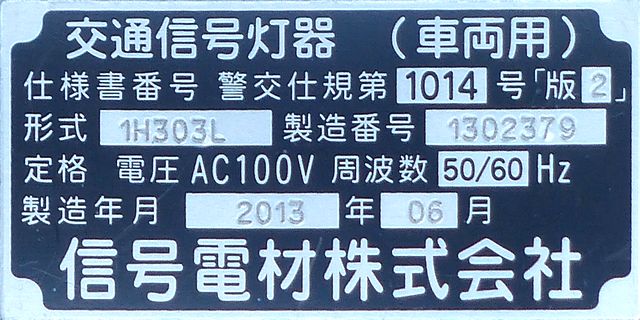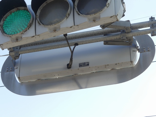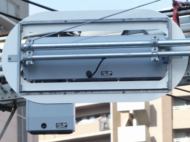 交差点ではない場所であり、信号を見落としやすいため、また、電車が専用軌道から併用軌道に出てくる箇所であり、信号を見落とすと危険なため、灯器に背面板が併設されています。
