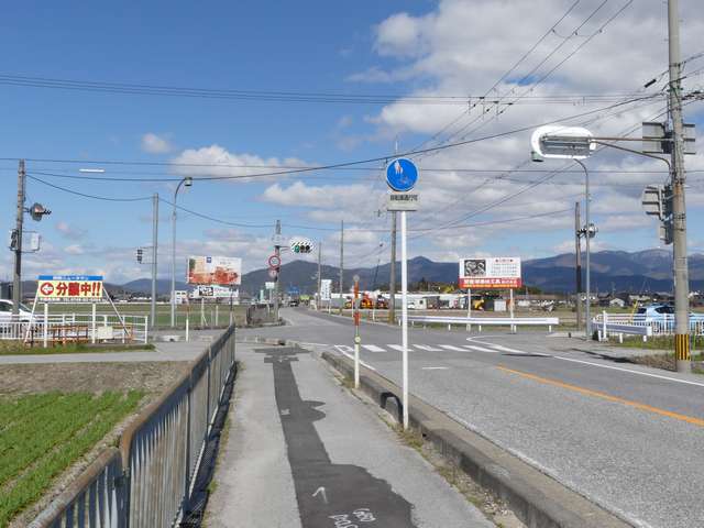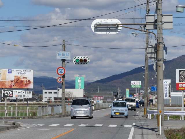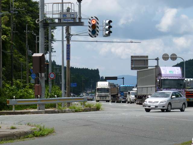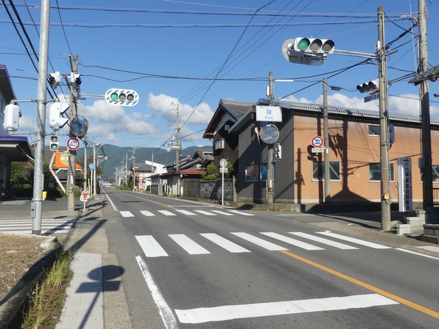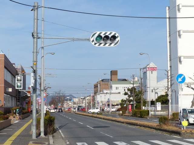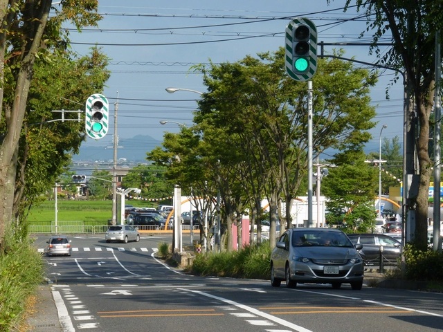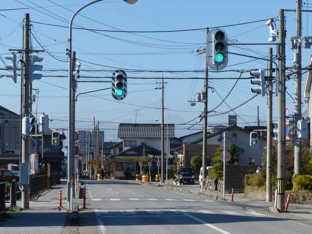 田園地域の交差点で、灯器を見落とさないよう、全方向の灯器に背面板が併設されています。