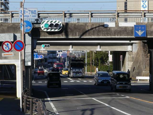 片側2.5車線の道路と片側0.7車線の道路の交差点で道路幅に差があるうえ、主道路側に横断歩道がなく、信号交差点であることを認識しにくいためか、主道路の両方の灯器に背面板が併設されています。