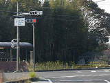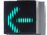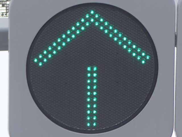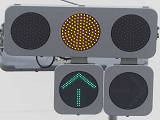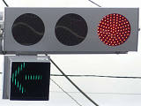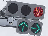 鋭角交差点での誤認防止のため、左右制限(左側制限)のSD制限フードを装着した信号電材製低コスト灯器が設置されています。左折以外が禁止されているため、青信号にはならず、左折矢印信号で進行させています。