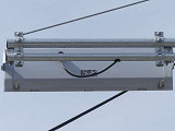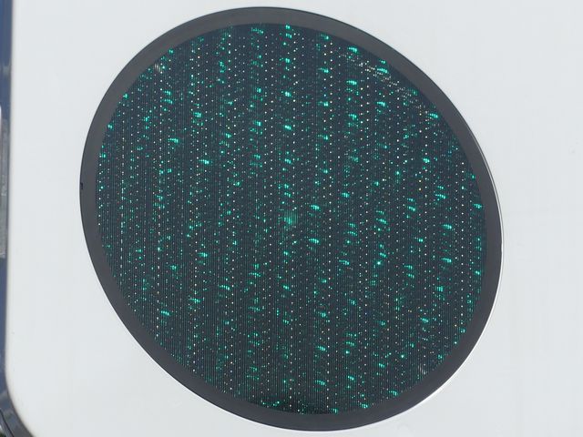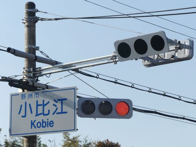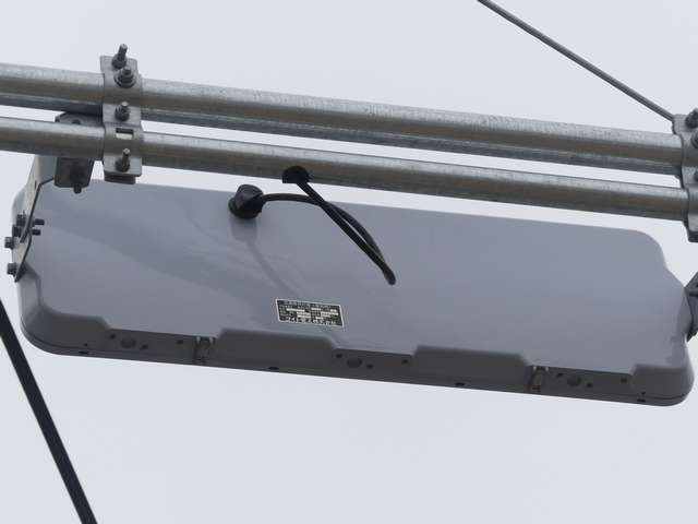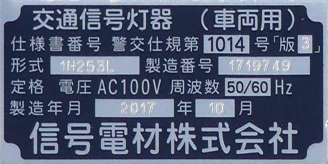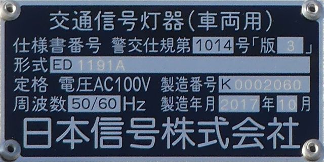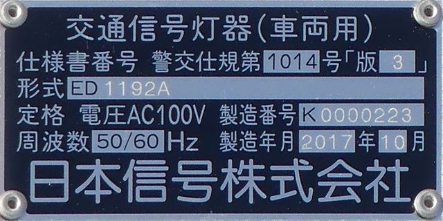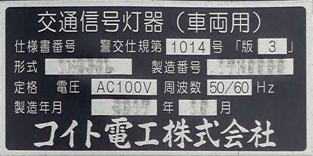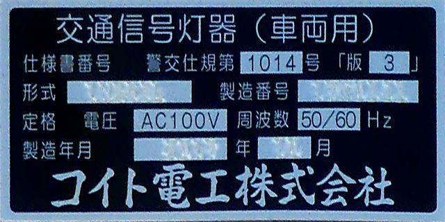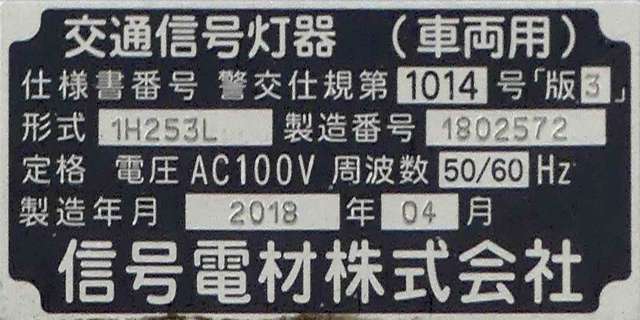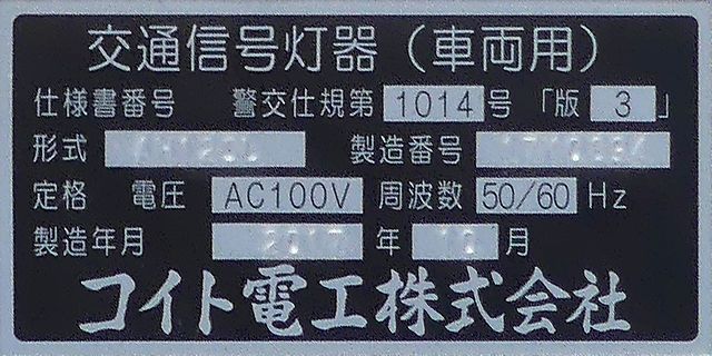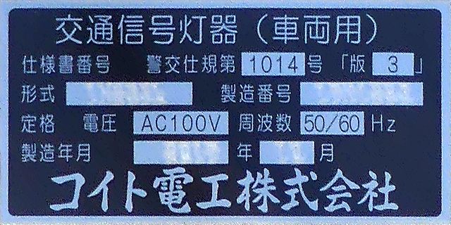 この更新工事(機器納品と設置工事が別発注)では、通常灯器は日本信号製が納品されていますが、「片かくしフードまたは同等品」指定の灯器は狭角レンズ仕様のコイト電工製が納品されています。