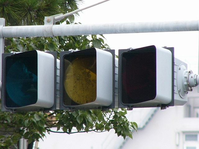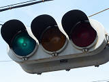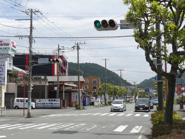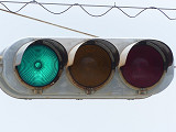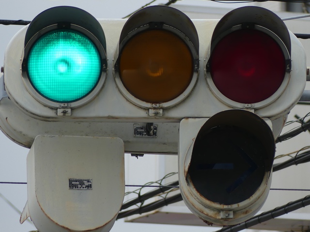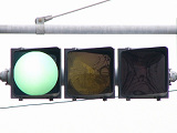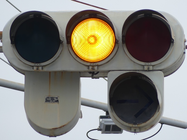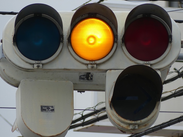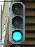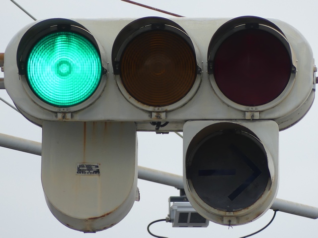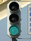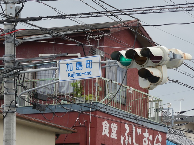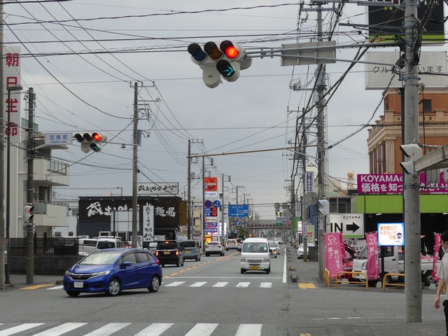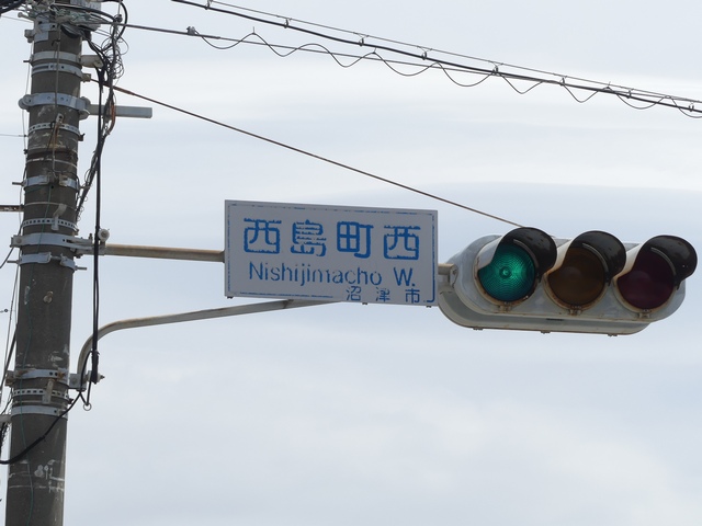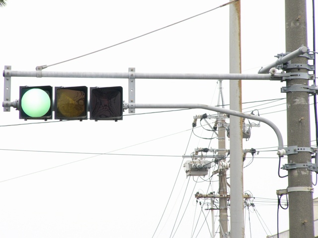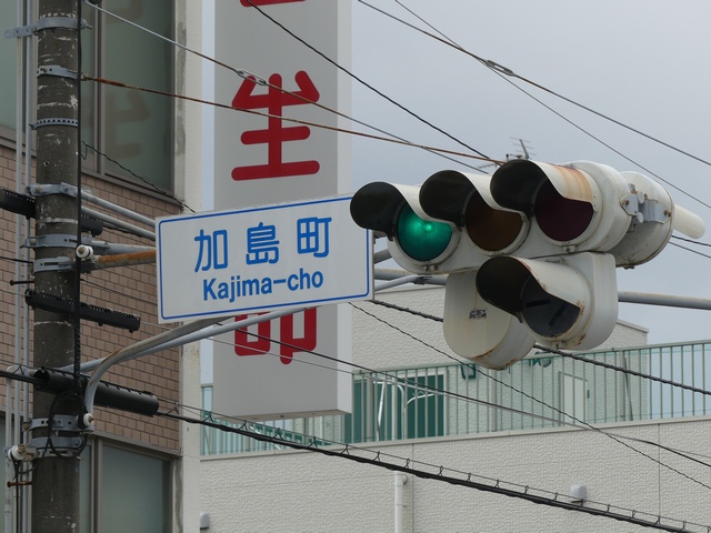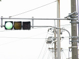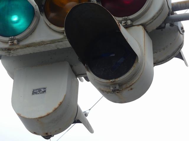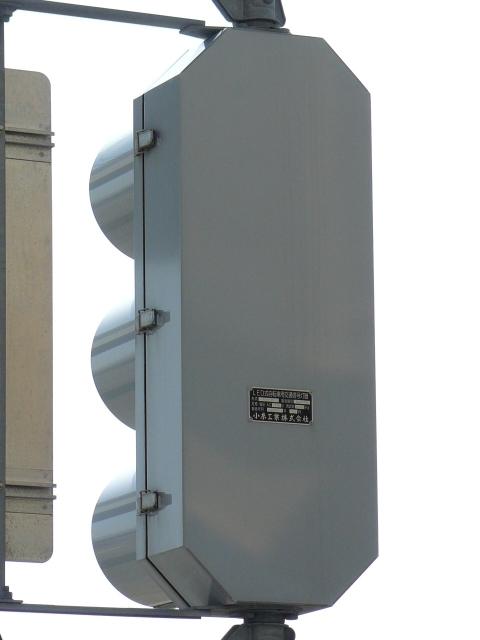 この交差点の主道路の主灯器として2台設置されています。背面灯器は製造時期が少し新しく網目模様レンズです。
