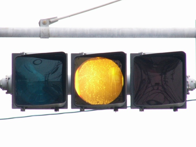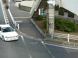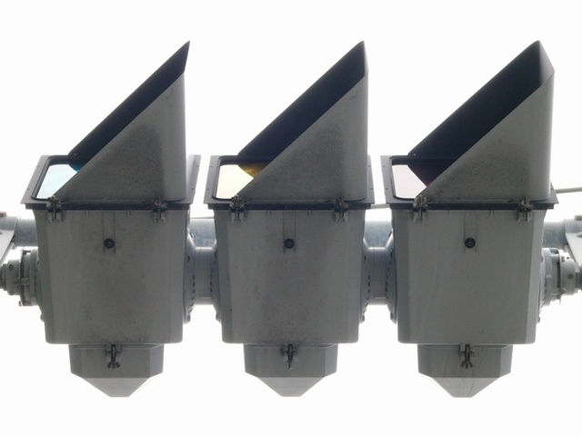 鋭角交差点の誤認防止のために偏光灯器が設置されています。昼間、誤認防止には偏光レンズで充分ですが、夜間はわずかに光が漏れるためかフードを横向きにしています。