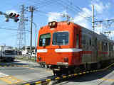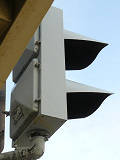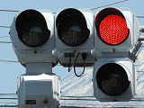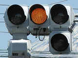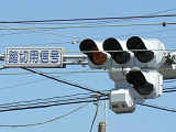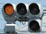 信号交差点に隣接する踏切の「踏切用信号」として使用されている灯器です。通常は左黄点滅で、列車が接近すると中黄、赤の順に変わり、踏切が作動します。なお、交差点に進入する側は、交差点の信号が赤になる少し前にも中黄、赤の順に変わります。