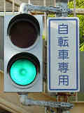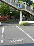 この交差点には歩道橋があり、道路上には自転車横断帯しかありません。その自転車横断帯では「自転車専用」の2位式灯器が使用されています。
