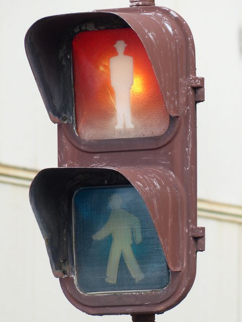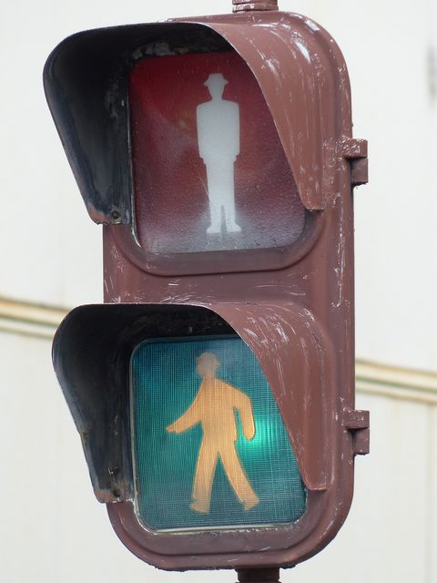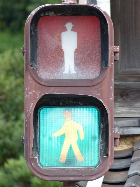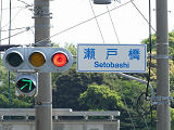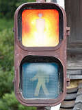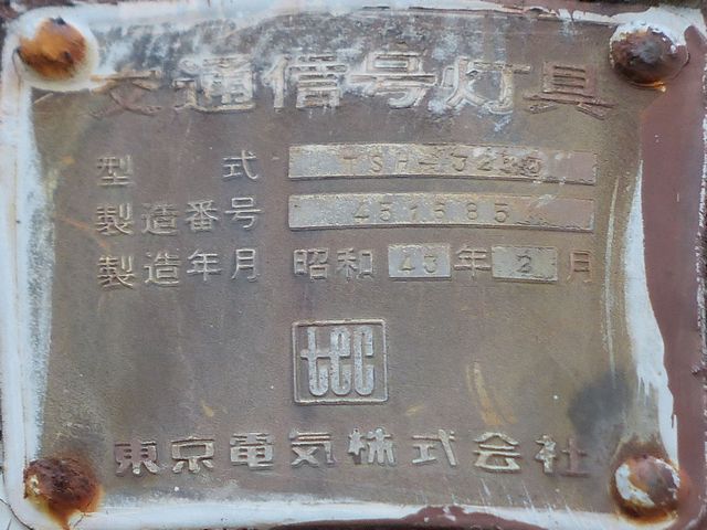 東京電気(現・東芝テック)という信号機メーカーとしては聞きなれない会社、「交通信号灯具」という聞きなれない名称の銘板が付いた灯器です。青レンズが交換されています。この交差点に1基だけ設置されています。