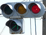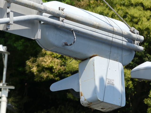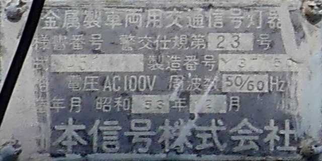 3色灯器が日本信号製の直径250mmレンズ灯器(製造年不明)、矢印灯器が日本信号製の直径300mmレンズ灯器(昭和53年12月製)です。
