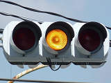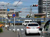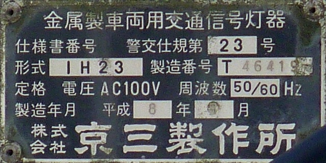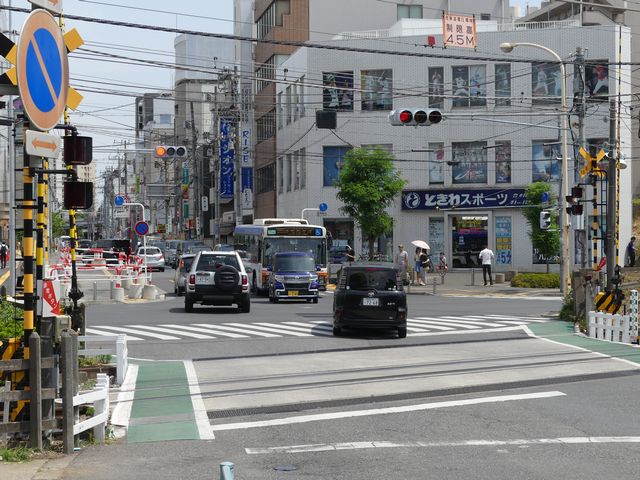 踏切に隣接する交差点のため、踏切と直交する側が青信号の変わりに左赤点滅になります。踏切信号はありません。踏切直交交差点流出側車両は、交差点の停止線で信号に従って一時停止をした後、踏切の停止線で道交法第33条に従って一時停止をする必要があります。交差点流入側車両は、踏切の5mほど手前にある信号交差点用の停止線で信号に従って一時停止をした後、踏切直前の踏切用停止線で道交法第33号に従って一時停止をする必要があります。
