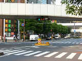 4方向の車両用灯器が、歩道橋下に懸垂型で設置されています。灯器の高さが基準に満たないためか、灯器の下を車両が通行しないよう、交通島が設置されています。