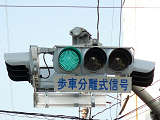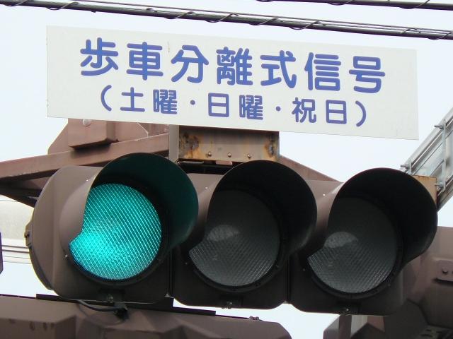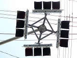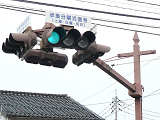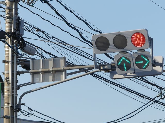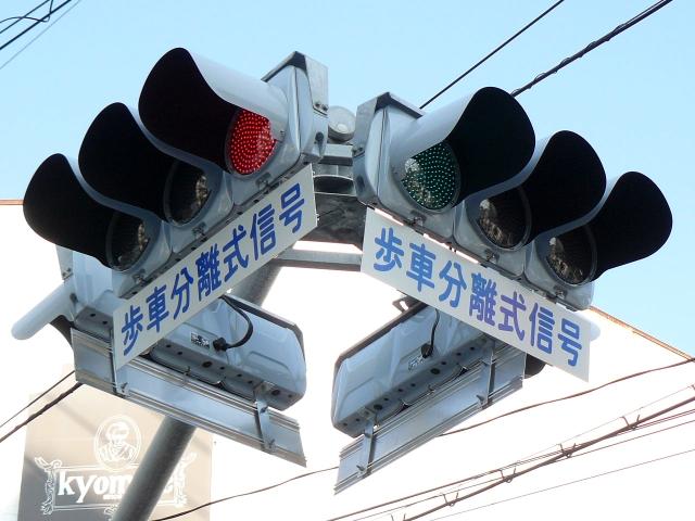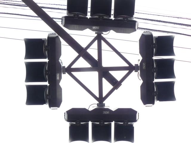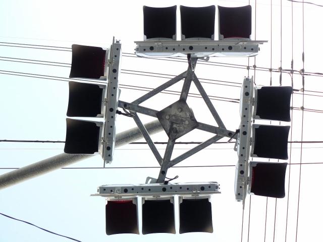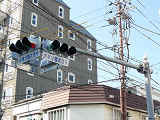 狭い交差点で四隅に信号柱を設置できないため、懸垂型で設置されています。