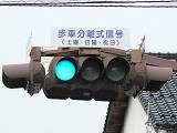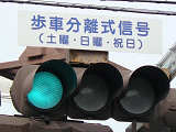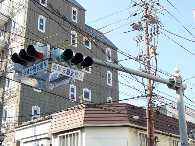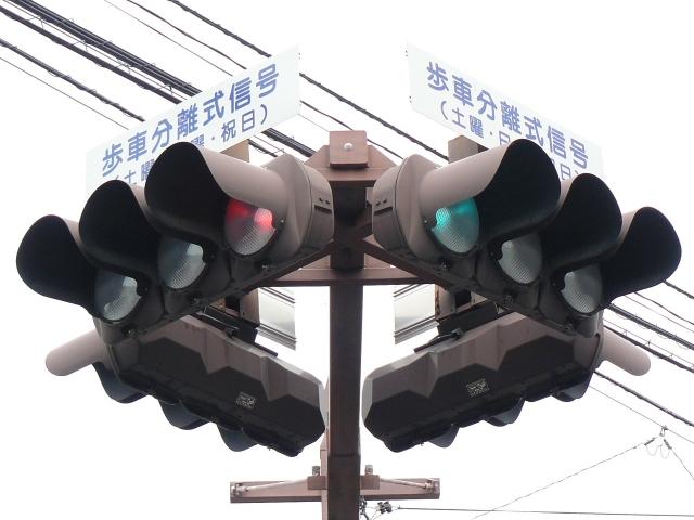 景観に配慮するため、車両用灯器を1箇所に集約して設置しているようです。歩行者用灯器は交差点の四隅に設置されています。