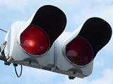 信号交差点手前の踏切に設置されています。踏切の動作とは連動せず、常時、左右の赤が交互点滅しています。前方の信号に気を取られて一時停止を怠る、あるいは前方の信号を踏切信号と勘違いするのを防ぐために設置されています。