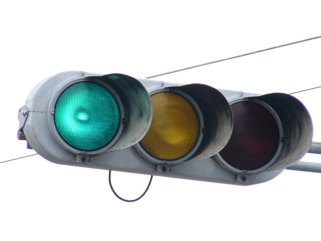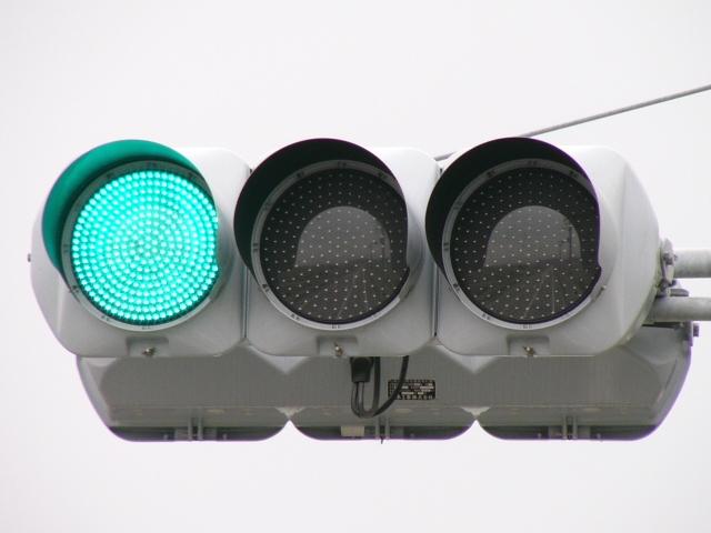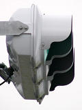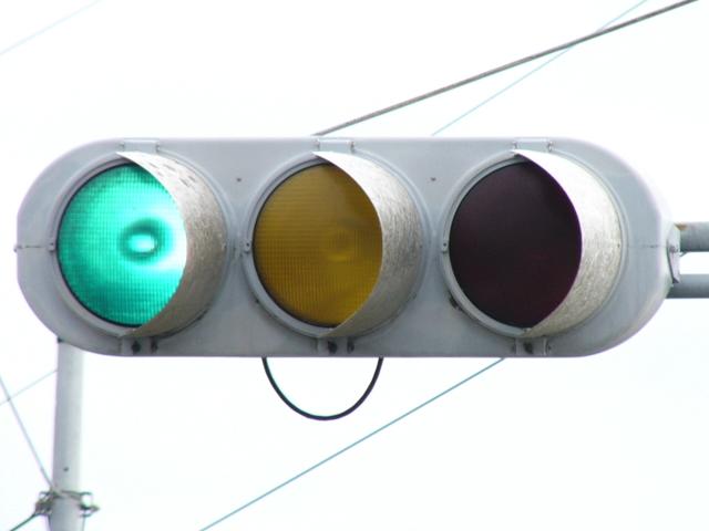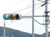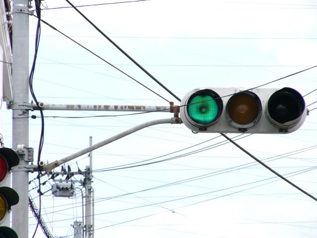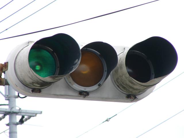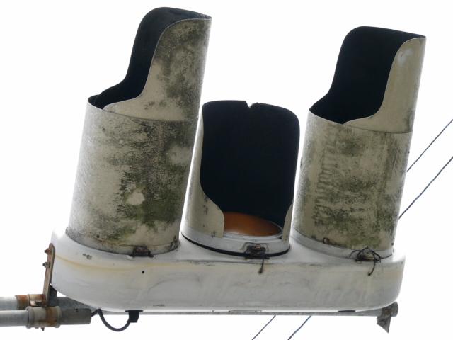 筒型フードにさらに横向きフードが継ぎ足されています。鋭角交差点ですが誤認防止のためなら筒型フードで十分です。青と赤の灯火をまったく見えなくさせることにより見切り発進を防止しているのでしょう。