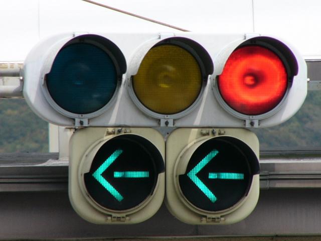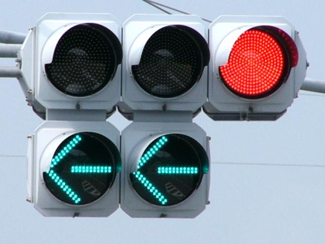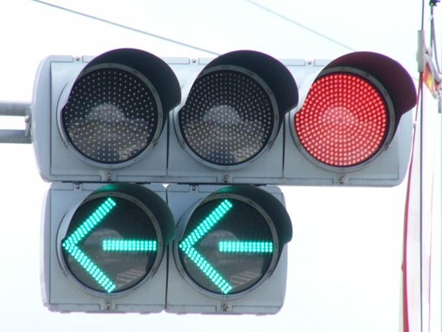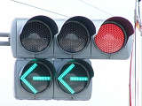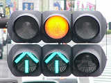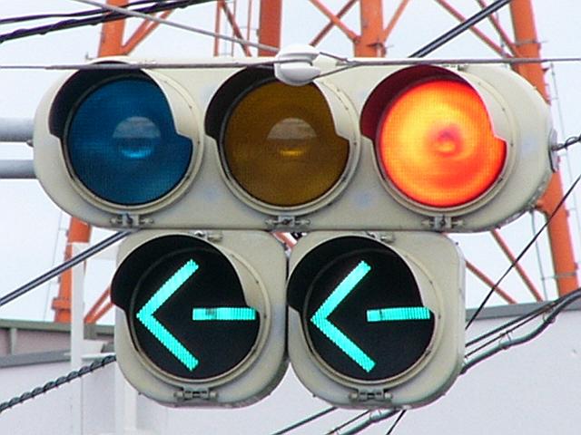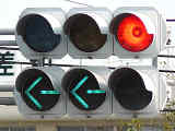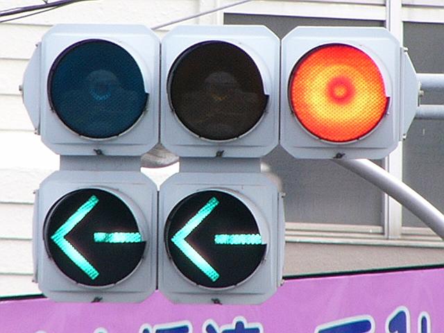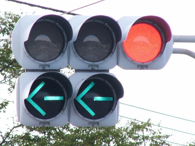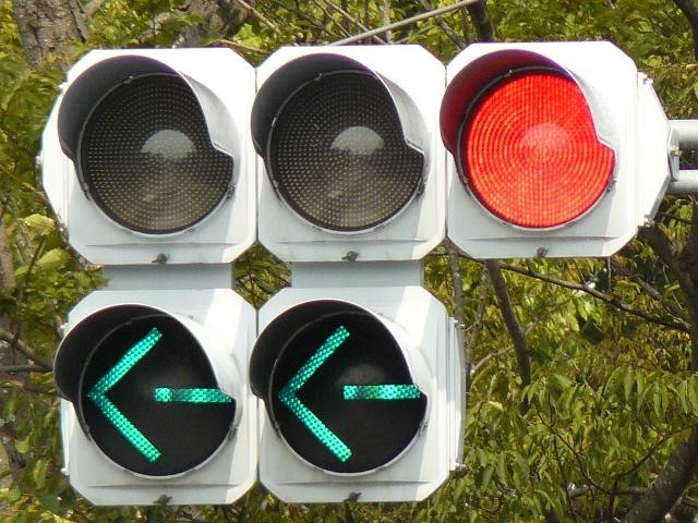 Y形交差点に下から進入する道路で使用されています。左折矢印が2つあるのは、赤信号の後に点灯し、見落としやすいためだと思われます。右折矢印は黄・・・赤の後、数秒で点灯し、ある程度予測できるため、1つしか設置されていないのでしょう。