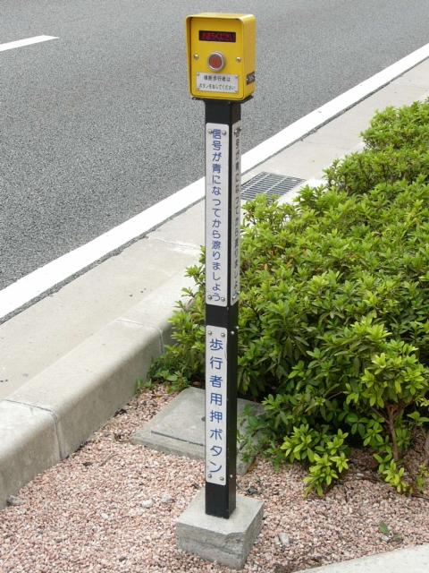 押ボタン箱が自立型設置されており、標示板もそれにあわせて細長いものになっています。