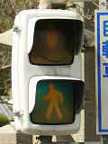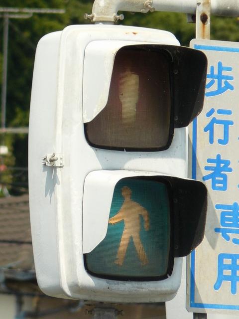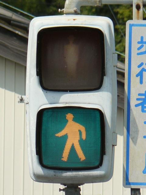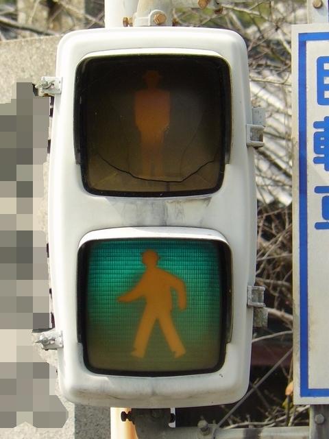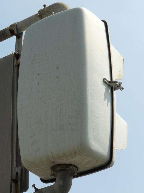 灯器裏面の中央に銘板を止める4つのピンがありますが、銘板がありません。この交差点のすべての歩行者用灯器がこうなっています。