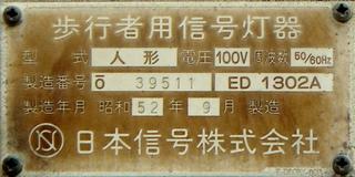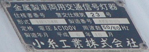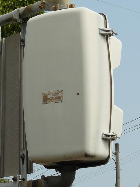 銘板には明記されていませんが、蓋止めが2つあること、蝶番が分厚いこと、灯箱に独特の膨張が見られることから、FRP製灯器だと思われます。銘板の右にネジ止めが1つあります。