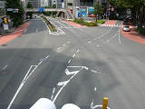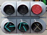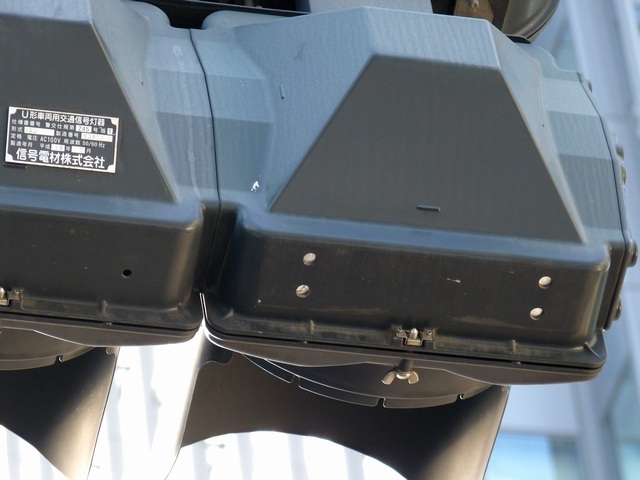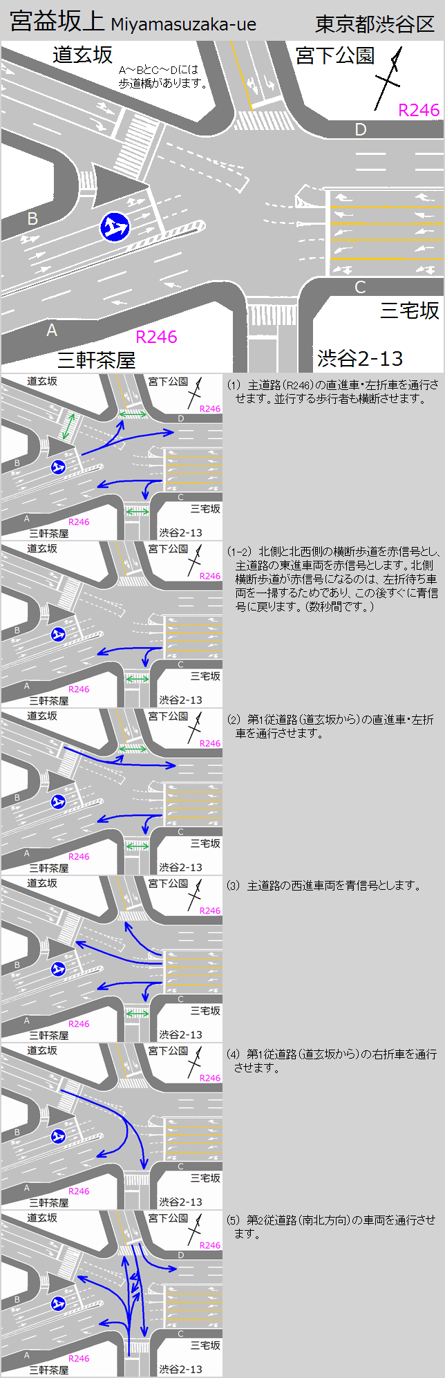 これは、「宮益坂上」交差点の西進用の灯器で、現在の信号サイクルでは、サイクル図(2)のときに斜め右方向へ右折できたとしても他の交通と交錯しないことから、当初はこのときに斜め右方向へ右折させるために、斜め右方向への右折矢印を使用していたと思われます。 しかし、赤灯の下に設置されていることから、通常の右折矢印と勘違いして宮下公園方面へ右折してしまう車両があったため、使用をやめたのではないかと思われます。また、一体型の3位式矢印灯器であり、矢印1位のみを撤去できないため、×印マスクで対応しているのでしょう。 |