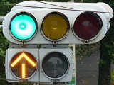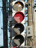 こちらでは、電車用に灯器が設置されています。縦型の3色灯器の上に黄矢印灯器を追加し、4位式灯器としています。青信号にはならず、黄矢印で進行します。