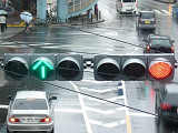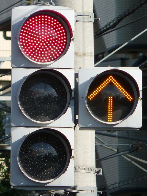 こちらは、並走する車両と同じ信号に従います。右折車分離式で青信号にならないため、黄矢印信号で進行します。