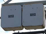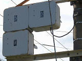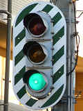 専用軌道ですが、道路との交差箇所で信号交差点となっている箇所があります。この交差点では、電車用として背面板を併設した縦型灯器が使用されています。