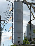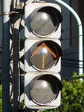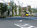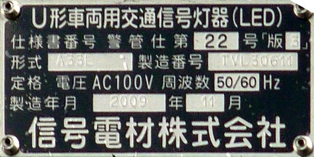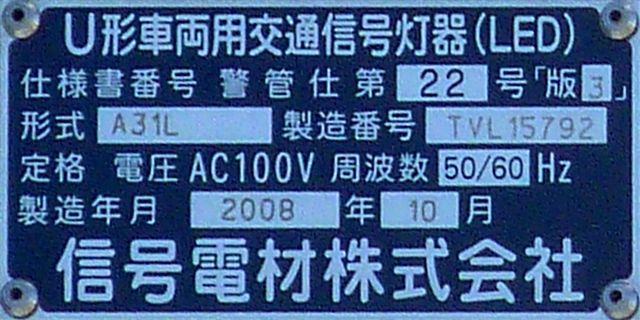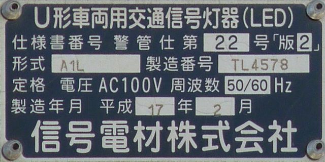 この交差点では、電車用に、縦型3色灯器の黄灯の位置に黄矢印を組み込んだものを設置しています。3位式ですが、黄矢印しか使用していないようです。