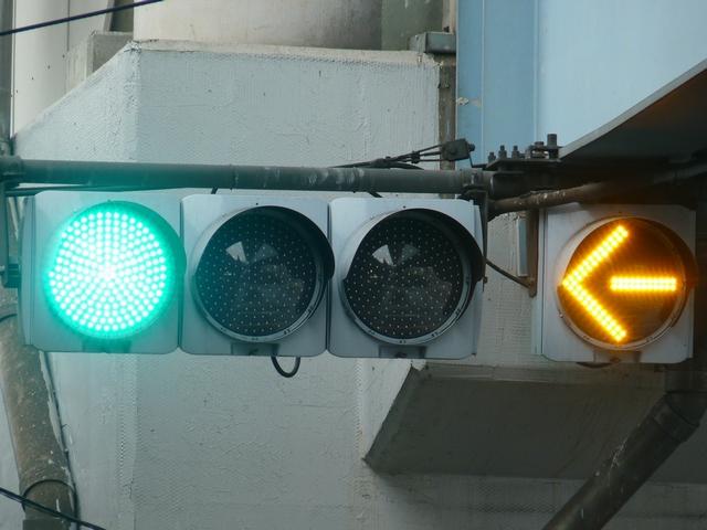 併用軌道から専用軌道に入る手前の交差点に設置されています。青信号のときに黄矢印が表示されます。