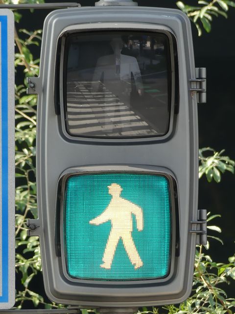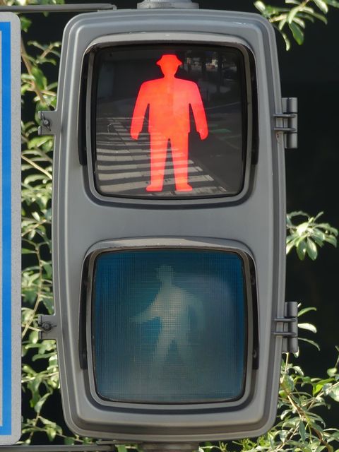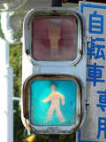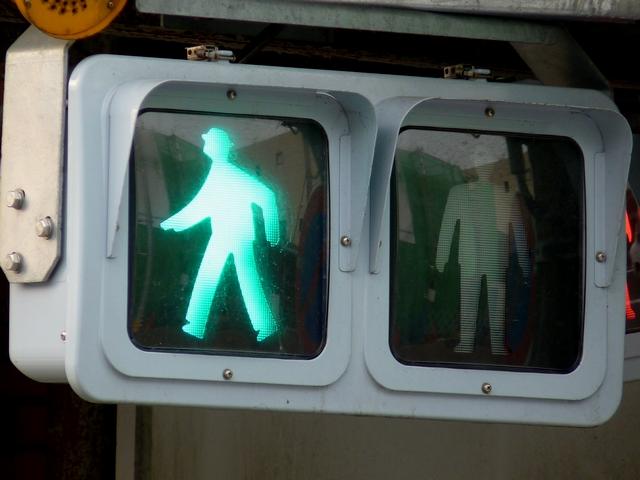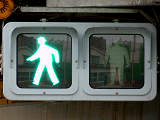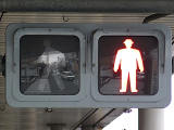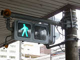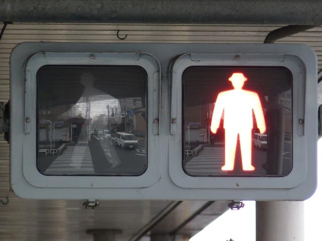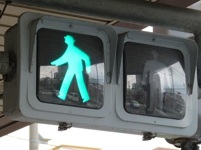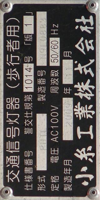 アーケードの下に歩行者用灯器を縦型で設置すると青灯の位置が低くなりすぎてしまうためか、横型で設置されている箇所があります。各社共通筐体で小糸工業の銘板がついています。上開きです。灯器背面からケーブルを取り出しています。レンズ下のフード取り付け準備穴は、ネジで塞がれています。