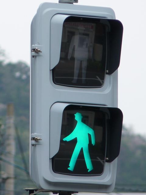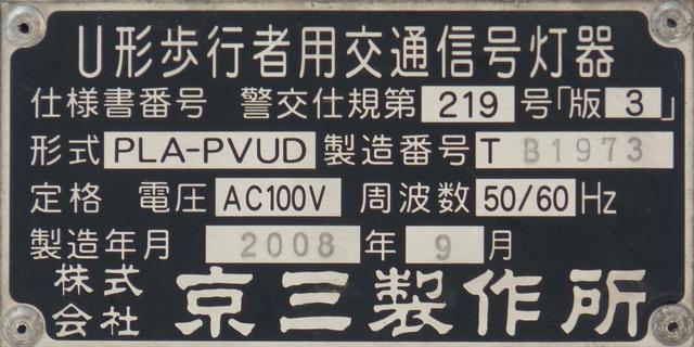 車道ぎりぎりに歩行者灯器を設置するので、車両の接触防止のために通常より短いフードを使用しているようです。