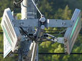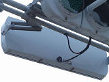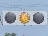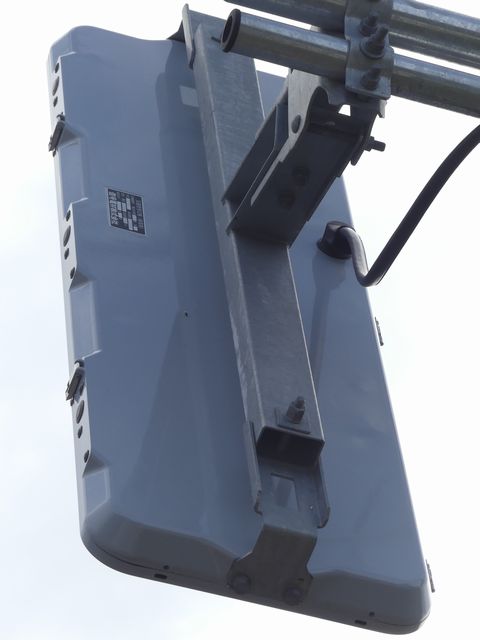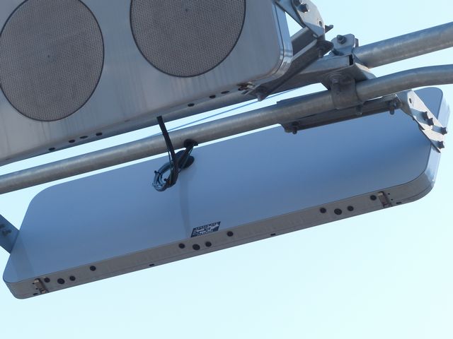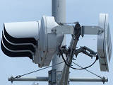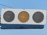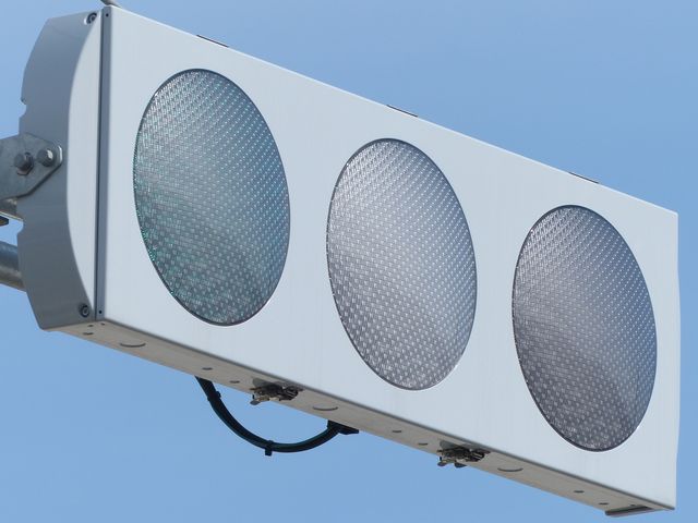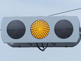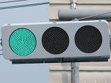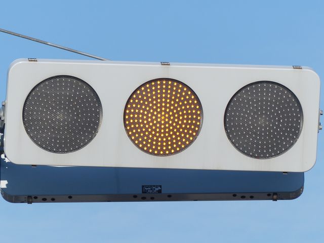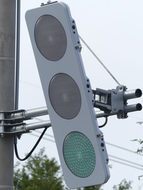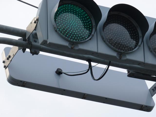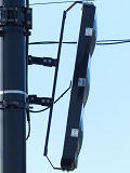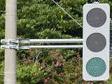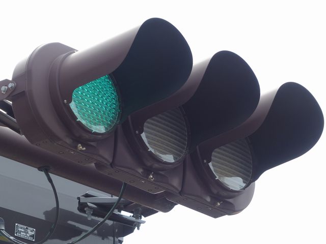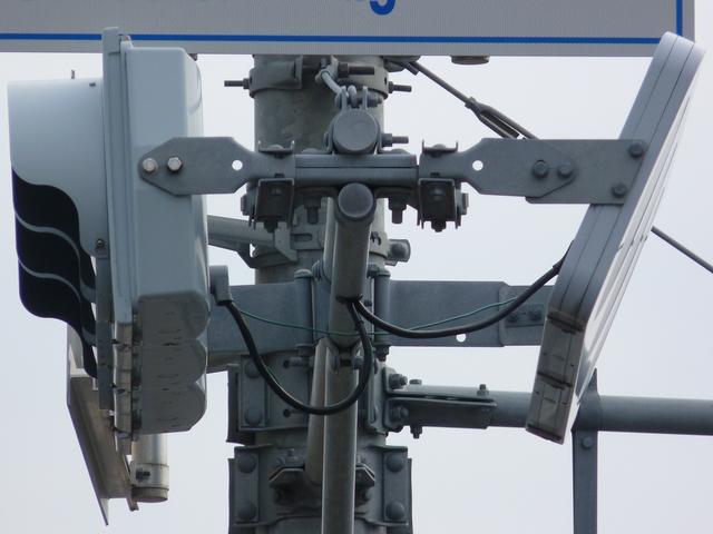 この交差点の西進用補助灯器として1基だけ設置されています。着雪や風の影響を受けにくくするためにフードレス化した灯器です。フードレス専用筐体で、フードの取付け穴が初めから開いていません。