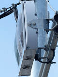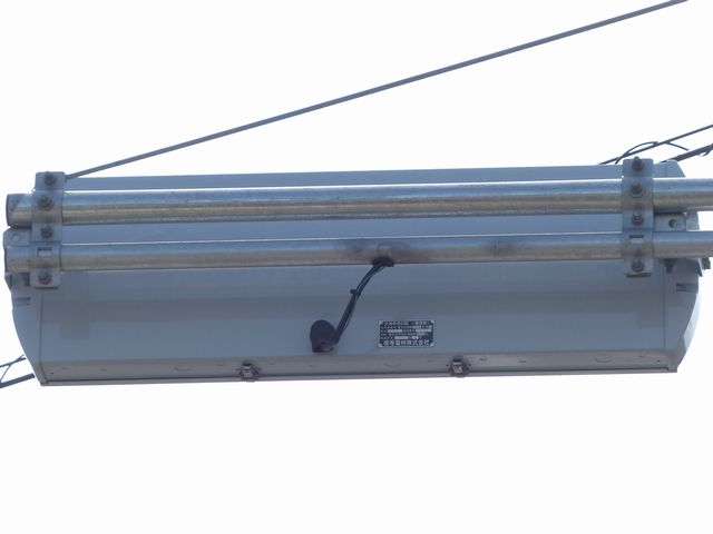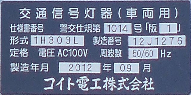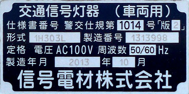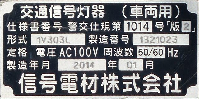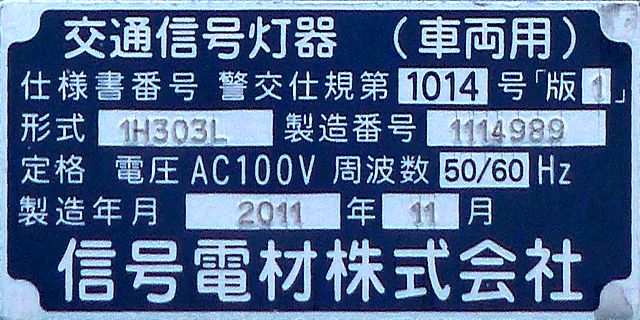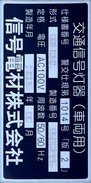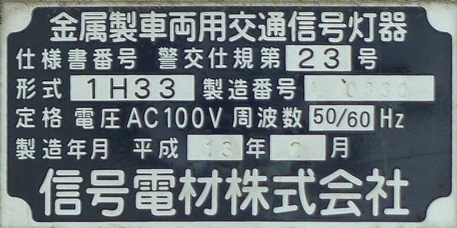OEMで、銘板では信号電材製となっています。コイト電工製と同じく銘板の打刻は浅く、ほぼ読み取れません。この交差点には横型設置のものもありますが、そちらも読み取れません。