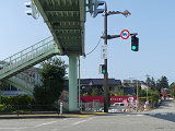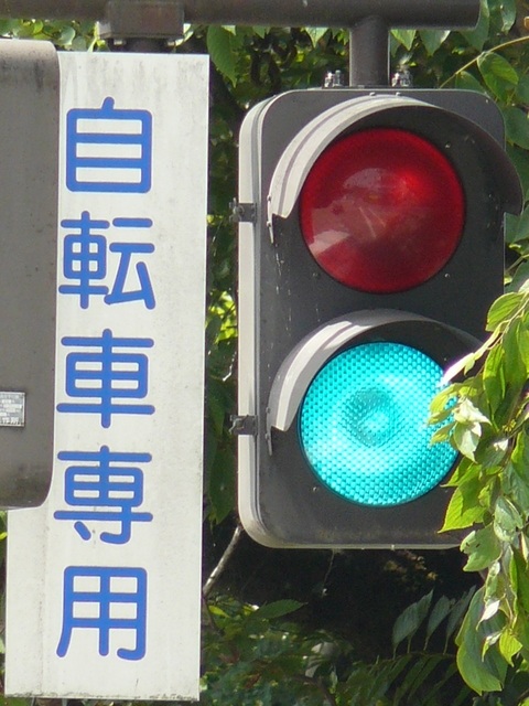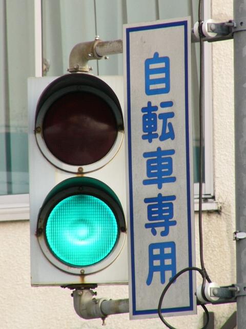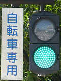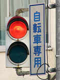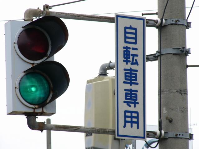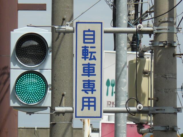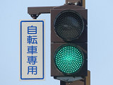 この交差点には地下横断歩道があり、道路上は「歩行者横断禁止」規制がされているため、道路上には自転車横断帯しかありません。その自転車横断帯では「自転車専用」の2位式灯器が使用されています。