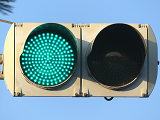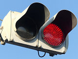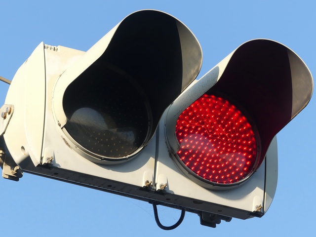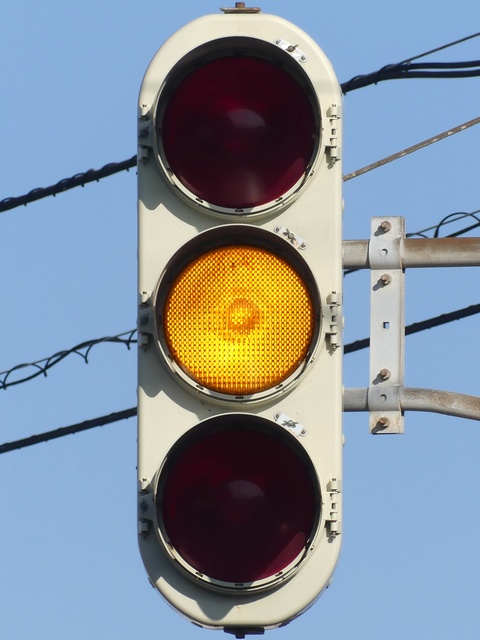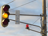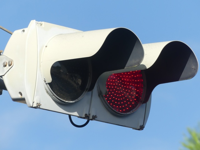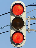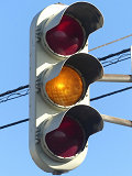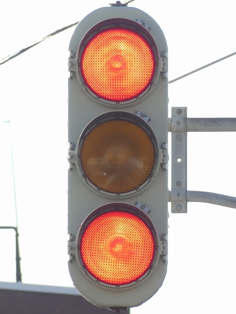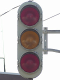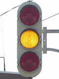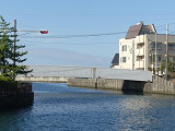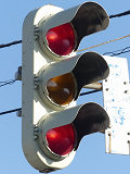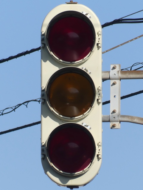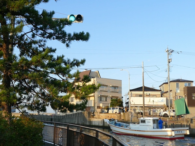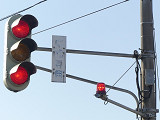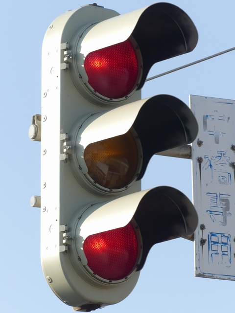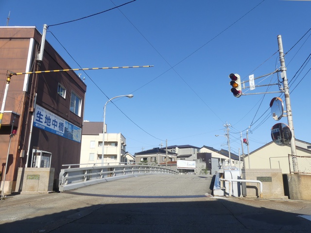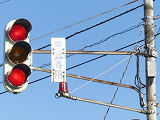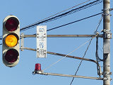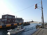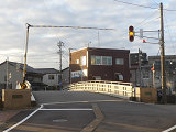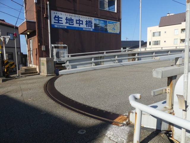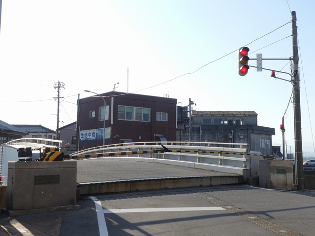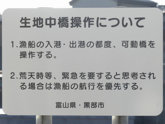 黒部漁港に架かる旋回式可動橋の生地中橋です。可動橋の両入口に赤・黄・赤配列の灯器が設置されており、通常(橋上の道路を通行できるとき)は黄点滅しています。橋の下をくぐることができない漁船が通過するときに操作管理室で操作して橋を旋回させ、そのときには上下の赤が同時に点灯します。赤になる前の黄点灯はなく、黄点滅からいきなり赤同時点灯になります。