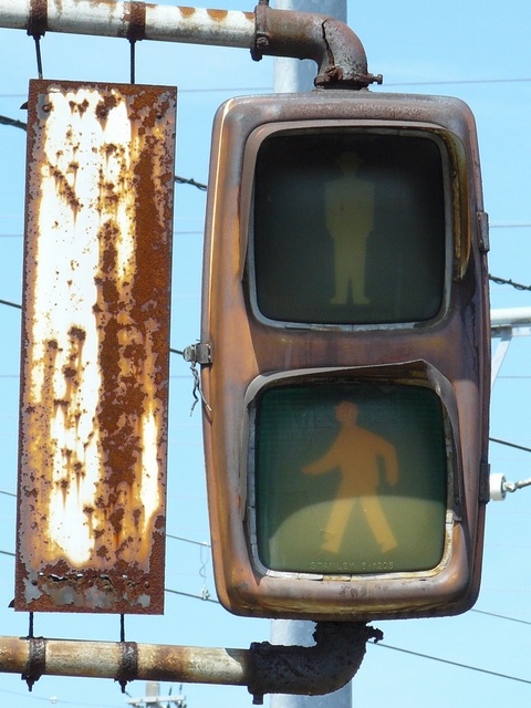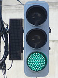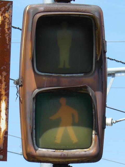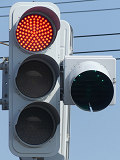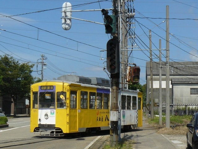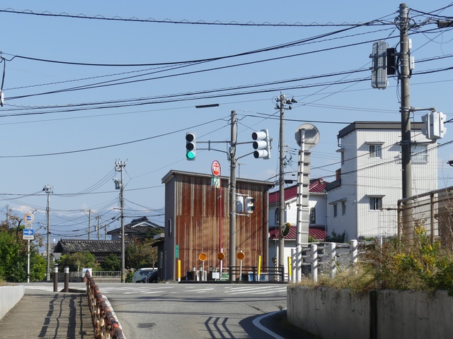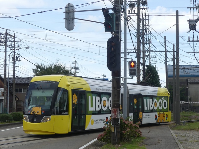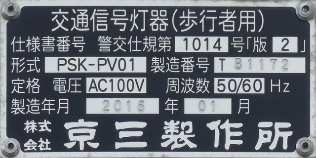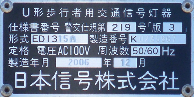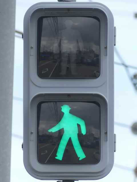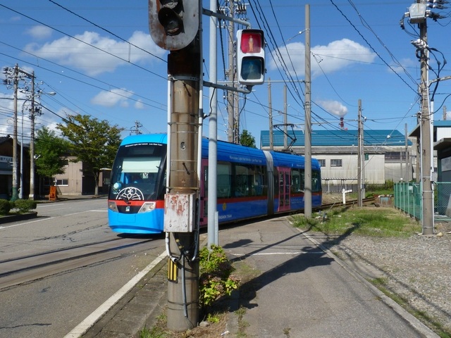 路面電車が専用軌道になる交差点に設置されていますが、なぜか横断箇所の手前に設置されています。そのためか、列車接近時には青点滅にならずにいきなり赤信号に変わります。(青点滅は横断開始前の歩行者に対しては赤信号と同じ意味のため。)