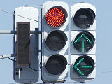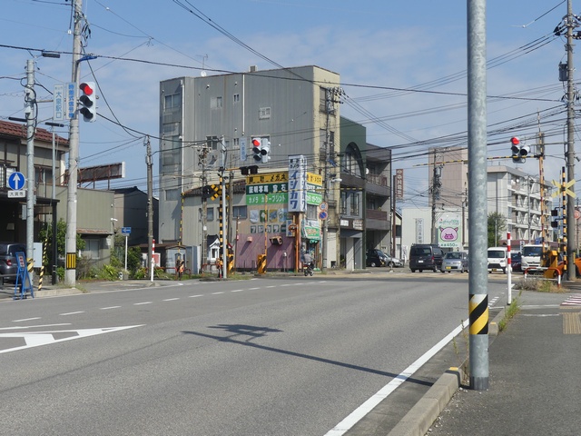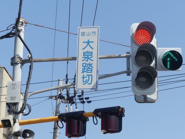 信号交差点隣接の踏切で踏切信号が設置されています。交差点が青信号のときは青信号で、交差点の交差側が青信号になると赤信号+↑になります。その後歩行者専用現示となるため、赤信号になります。ただ、直進矢印信号が出ている状態から黄信号を挟まずに赤信号になります。