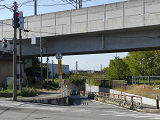 幹線道路の6差路に鉄道ガード下を通る狭い道路(約450m)が交差しており、交差点用信号がガード下の交互通行用信号を兼ねています。交互通行により交差点部分で車両用を全赤とするクリアランス時間がかなり生じるため、その時間を利用して歩車分離式としています。