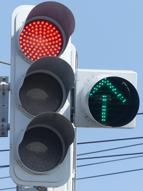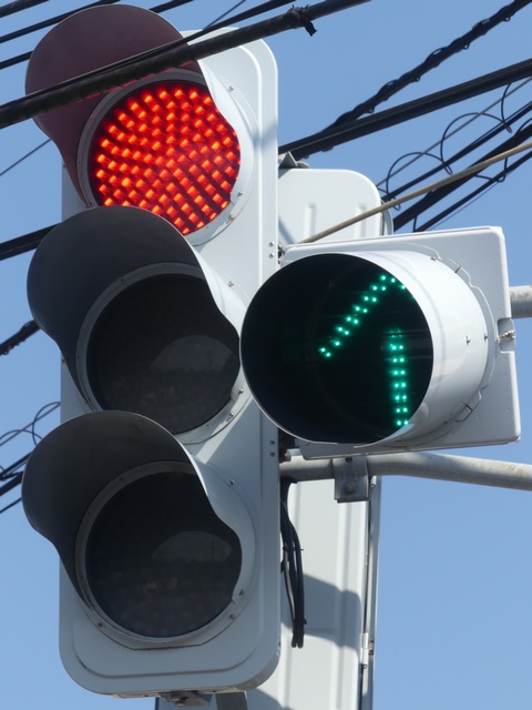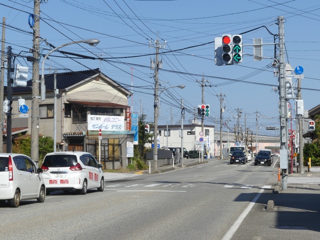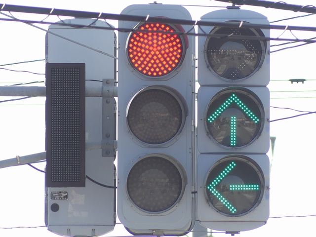反対側には歩行者用灯器は設置されていませんが、車両用灯器が設置されているため、その信号に従って横断します。