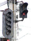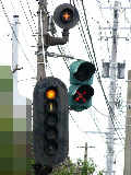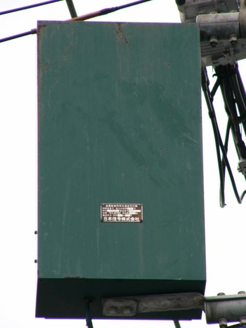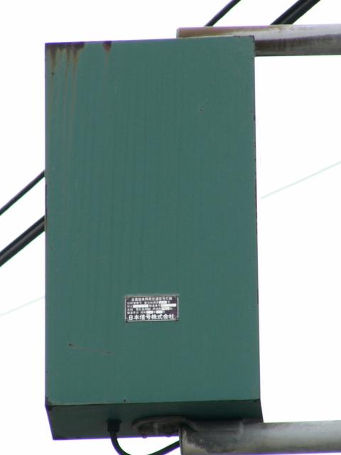 以前は緑塗装の灯器が設置されていましたが、信号柱がデザイン柱に交換された際に専用灯器に交換されました。なお、撤去された緑塗装の灯器は「江尻」交差点で再利用されています。(製造番号より判断。)