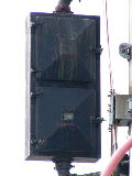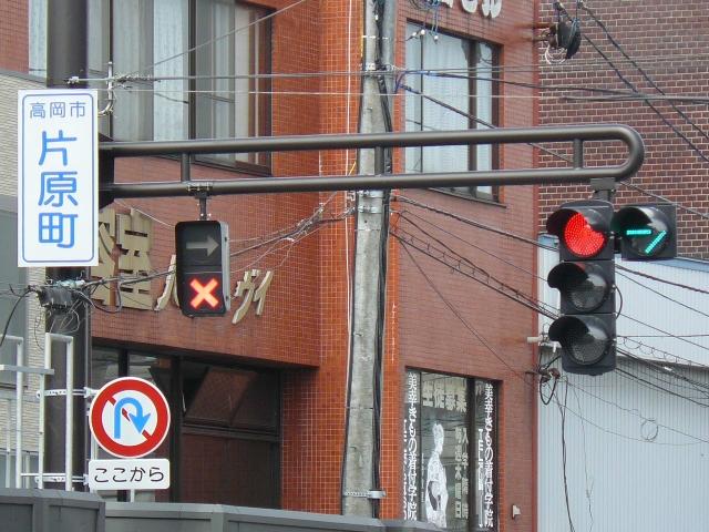 以前は角型灯器が設置されていましたが、現在は「片原町」交差点で撤去された緑塗装の灯器が転用されています。