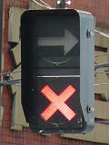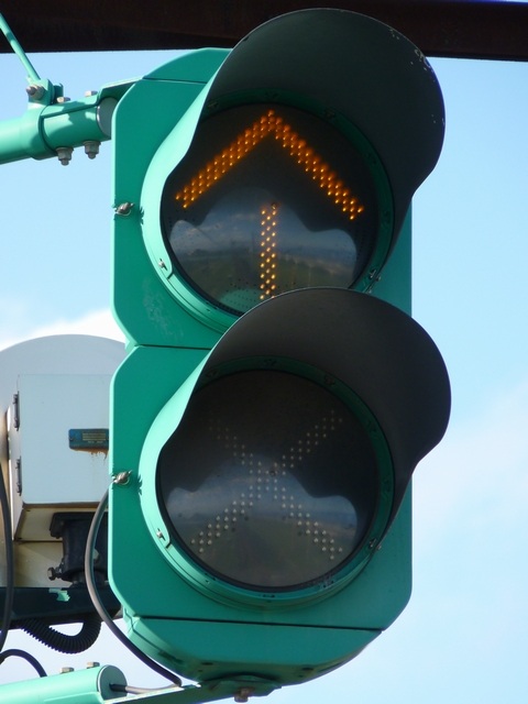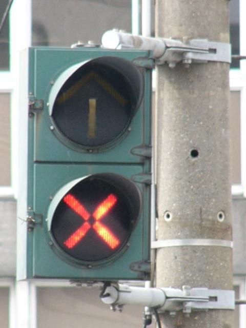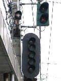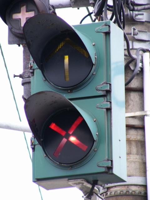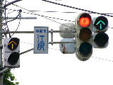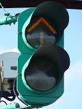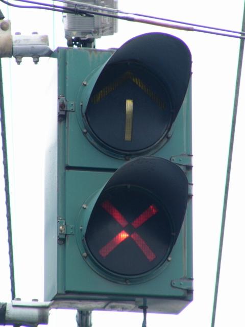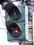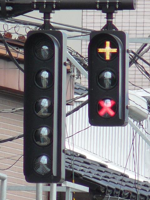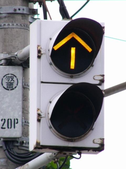 青信号にならない交差点なので黄矢印信号がでます(路面電車は青矢印信号では進めません)。路面電車の有無にかかわらず、車両が直進できる時に黄矢印信号がでます。(左折車は常時「左折可」。)