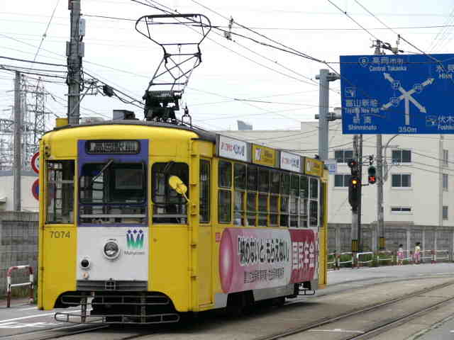 片原町停留所。矢印が旧型のものです。