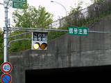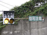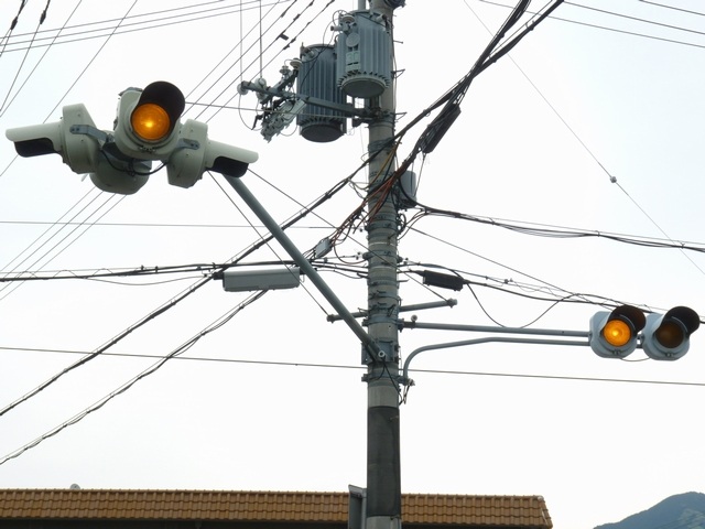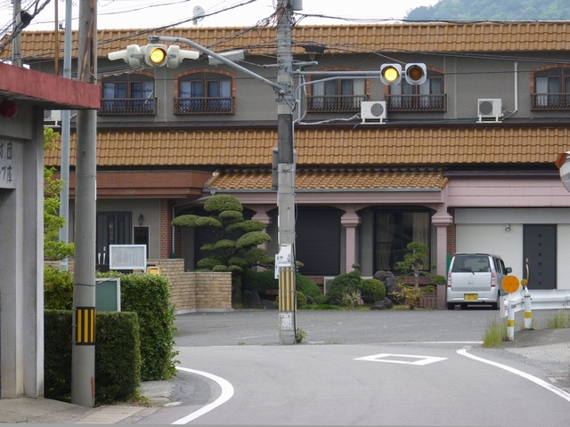 カーブの先に4方向1灯点滅の交差点があるため、カーブ手前から見えやすい位置に左右の黄が交互点滅する灯器が設置されています。