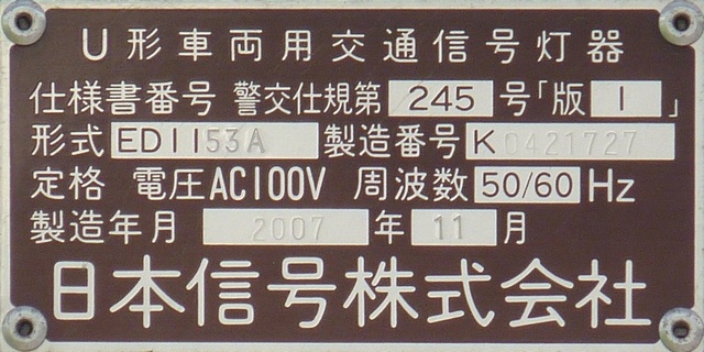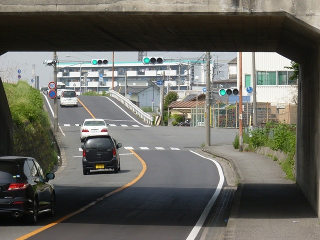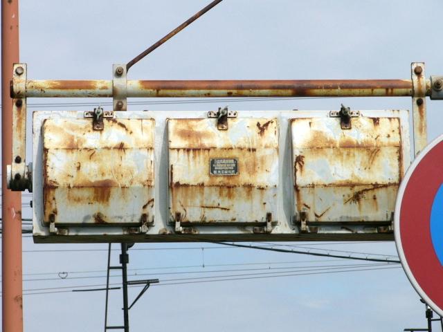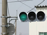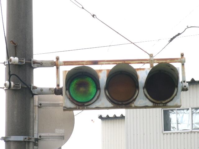 下り坂後の鉄道ガード奥に設置された低い位置の補助灯器です。以前は、青レンズの焼けた角型灯器が設置されていました。