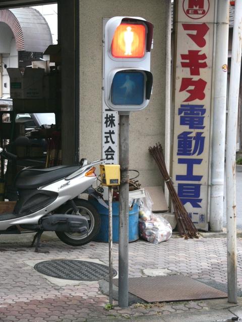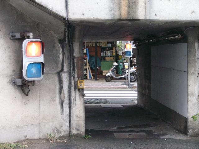 高架道路下の低い位置に設置されている歩灯です。特に手前の歩灯は低くて、押ボタン箱と同じくらいの高さです。
