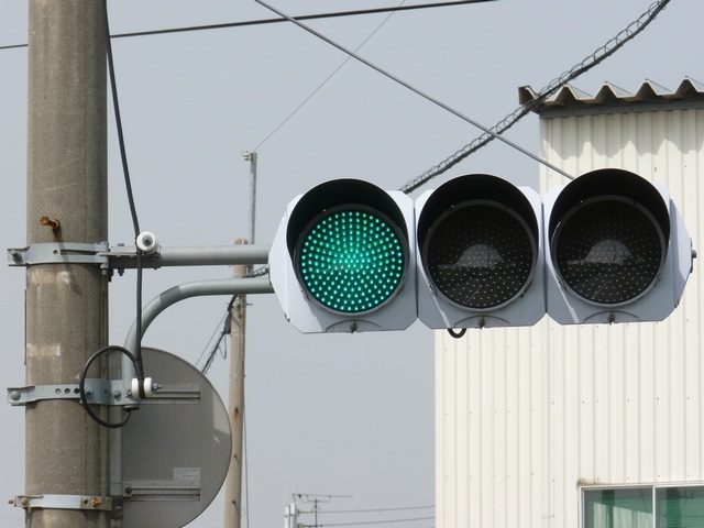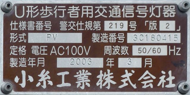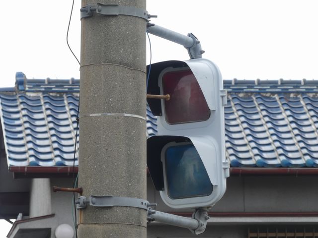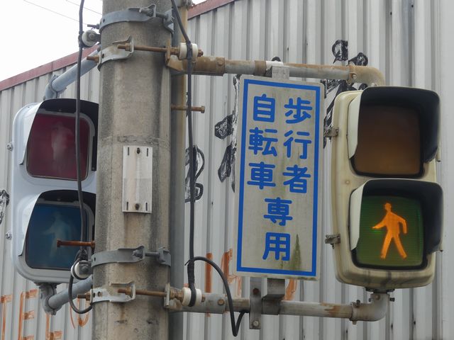 横断歩道を設置する予定があったのか、横断歩道のない場所に歩行者用灯器が設置されていますが、滅灯させて信号柱の方に向けています。