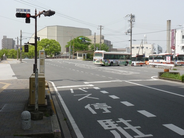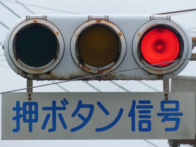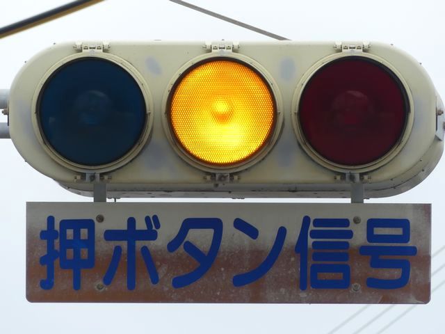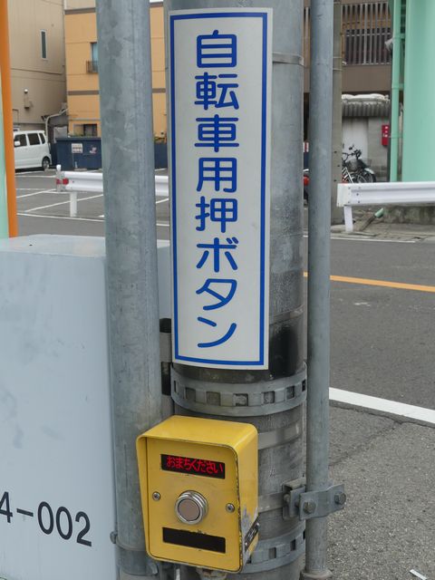 押ボタンを押下すると、しばらく主道路が青信号、従道路が赤信号となるため、従道路自転車は一時的に横断できなくなり、その後主道路が赤信号、従道路が青信号となり、主道路車両の通行がない状態で横断できるようになります。 なお路面の自転車横断帯は、以前あった自転車の記号が消えてしまっているため、法的効力がないかもしれません。